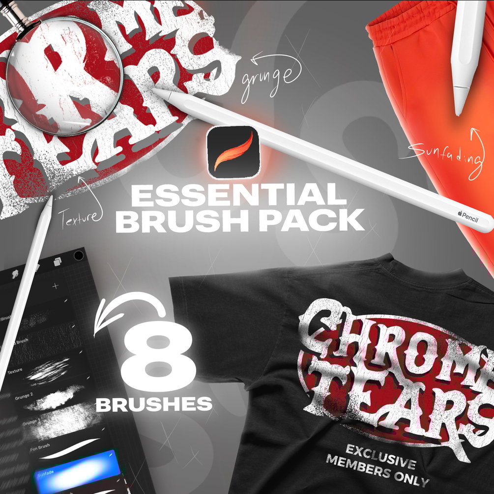 Introducing the Essential Procreate Brush Pack, perfect for clothing brands and graphic designers alike. With 8 carefully crafted brushes, this collection elevates digital design projects with stunning textures, grunges, sun faded brushes and more. I use these brushes literally everyday, so It's the go-to toolkit for bringing creative visions to life with precision and style.
